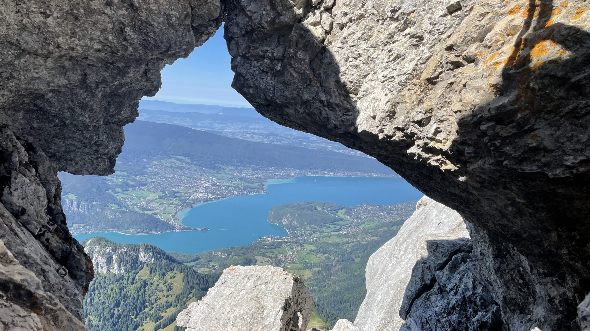 Nous reprenons notre progression par une arête avec vue sur le lac d'Annecy d'un côté et le Mont Blanc de l'autre.