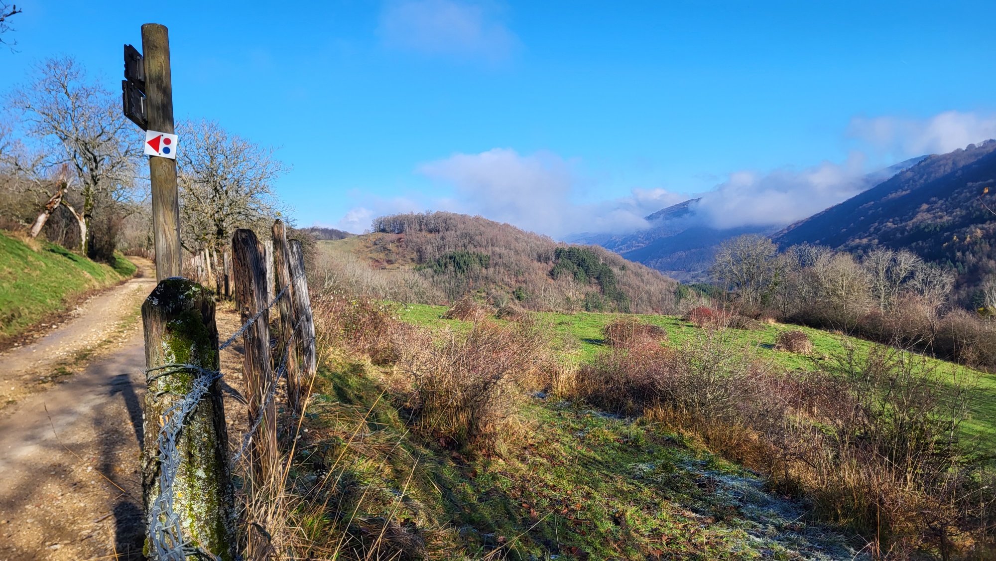 Nous rejoignons le GR59, et entamons la principale montée du jour. Le givre est encore bien présent sur les feuilles au sol, les flaques d’eau sont gelées, le soleil devient plus présent.