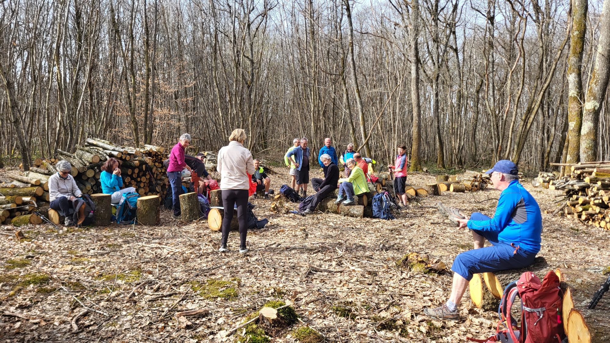 Nous continuons dans les bois et à midi une opportunité s'offre à nous avec une clairière où une coupe de bois seulement réalisée nous permet de prendre notre repas bien à l’abri, au soleil assis sur des rondins de bois.