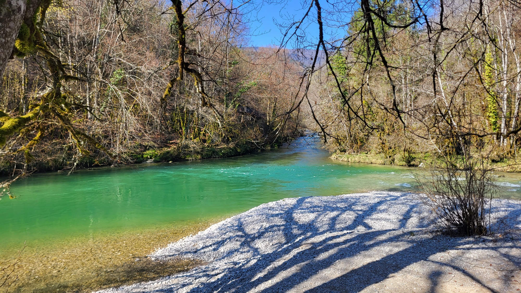 Très bel endroit avec une plage de galets, la rivière est d'une belle couleur émeraude.