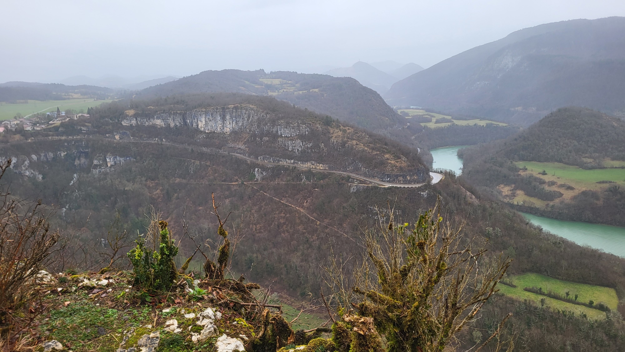 Arrivée à la falaise, malgré le manque de soleil beau panorama depuis le belvédère de la Reculée avec vue sur les méandres de la rivière d'Ain.